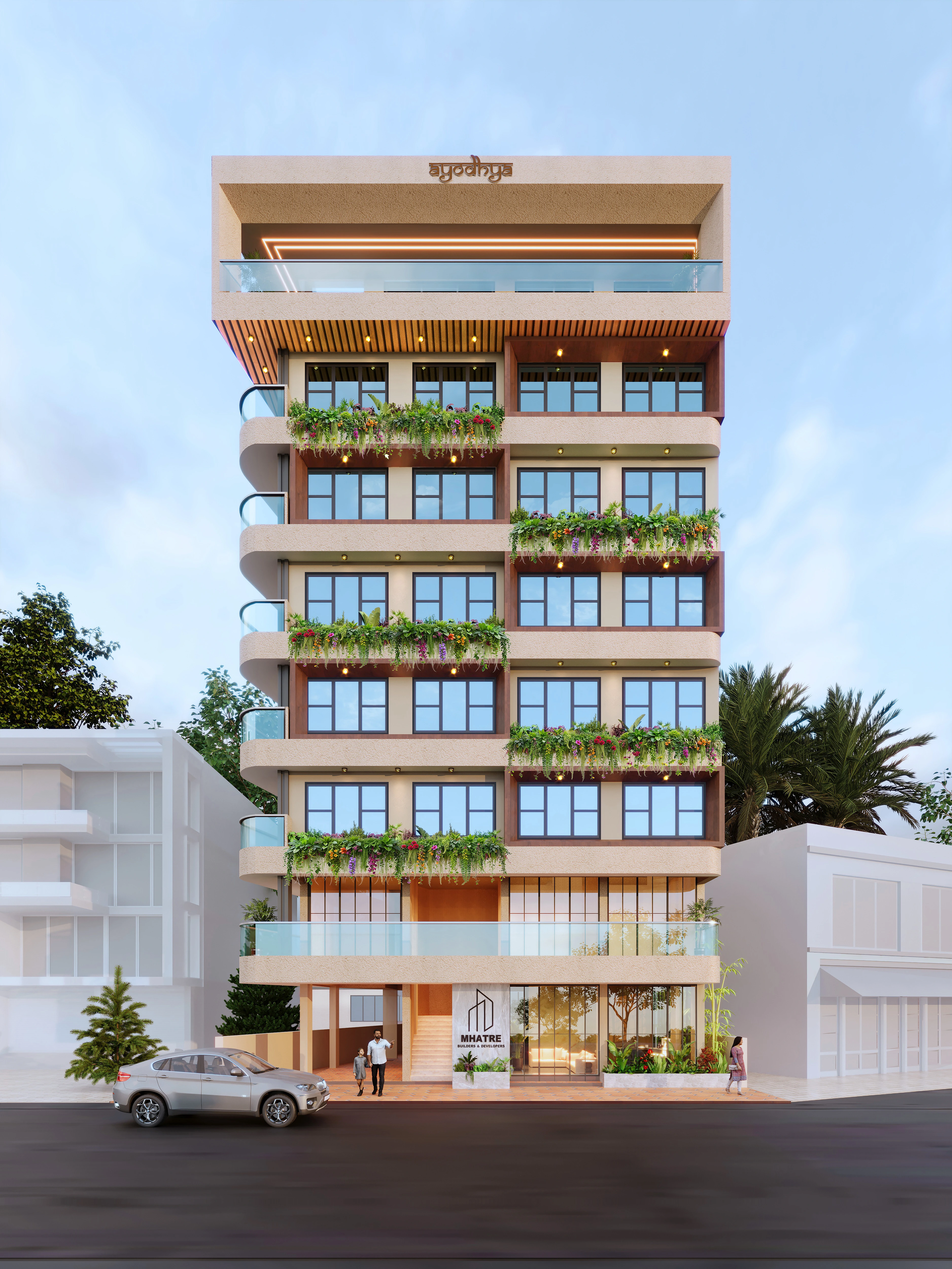 Contemporary residential elevation with lush green balconies for elegant urban living.